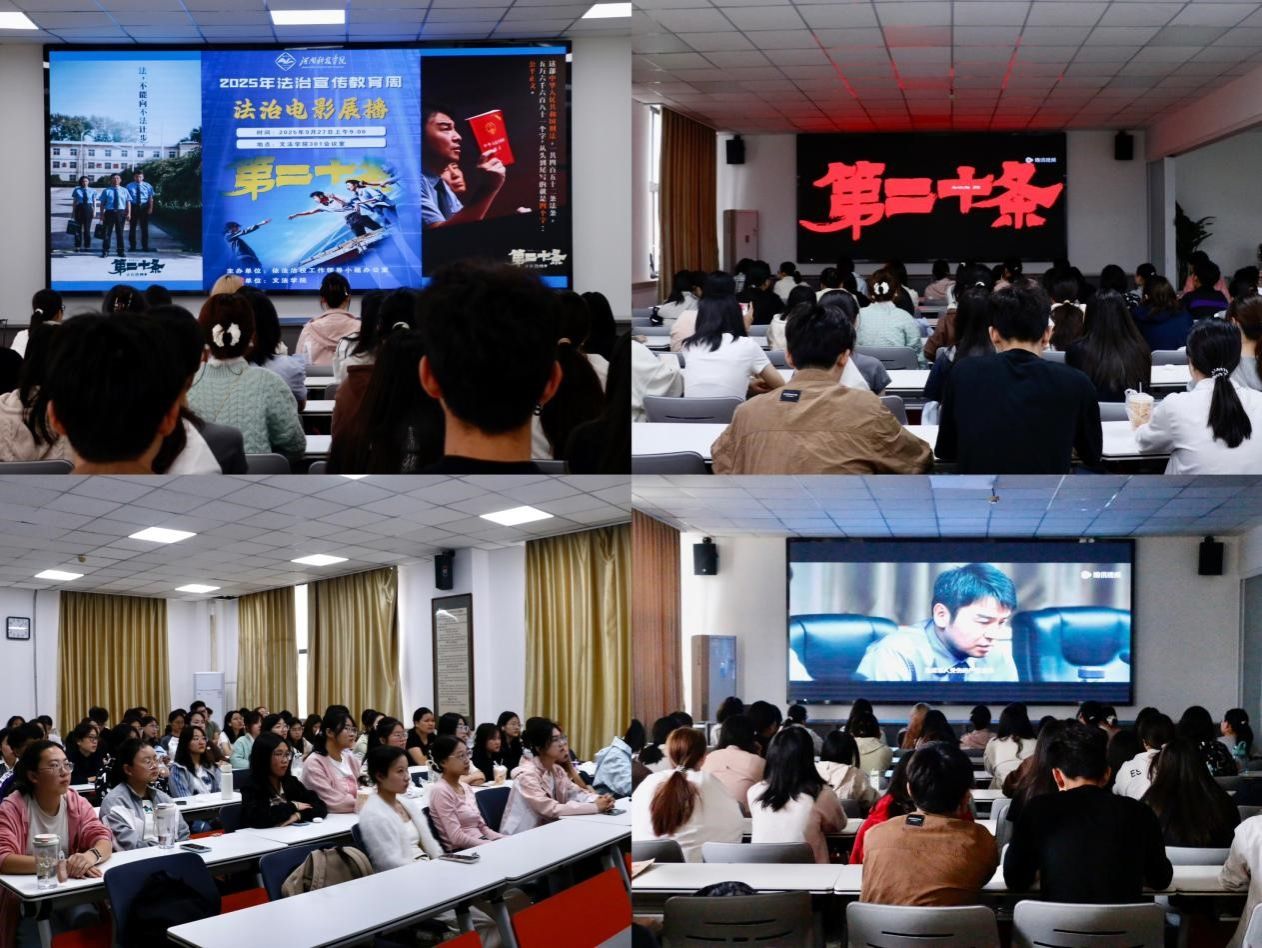 同日,学校还组织学生集中观看了法治题材电影《第二十条》。影片以生动感人的故事,阐释了刑法中关于正当防卫的法律规定,围绕校园霸凌、公共骚扰、名誉权侵害等现实议题,引导学生深入思考情与法的关系。观影活动寓教于乐,有效提升了学生依法维权和化解矛盾纠纷的能力。