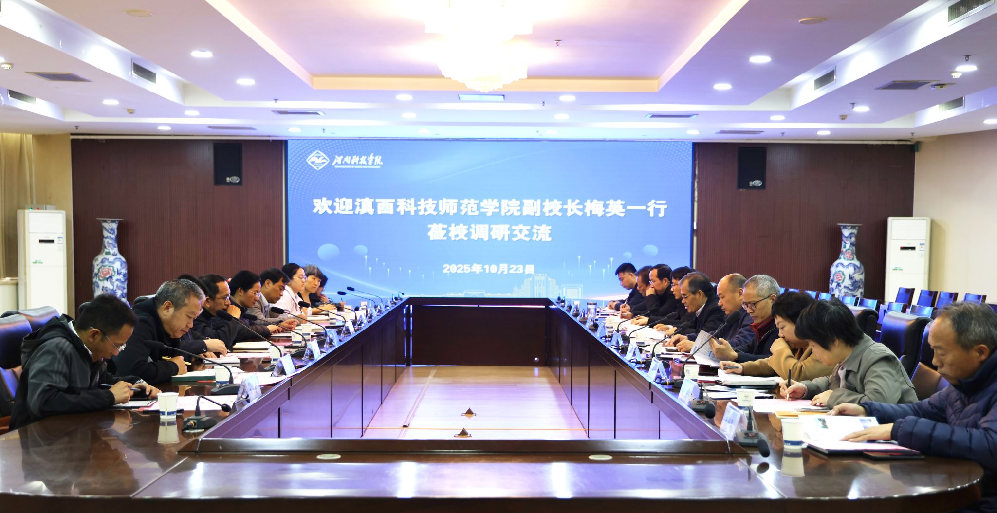10月23日,滇西科技师范学院副校长梅英一行莅校调研交流,调研座谈会在办公楼206会议室举行。校党委副书记王庆兵出席会议,校长办公室、校团委、教务处、研究生处、教学质量监控中心、农学院、数学科学学院、教育科学学院、体育学院等单位相关负责人参加会议。
