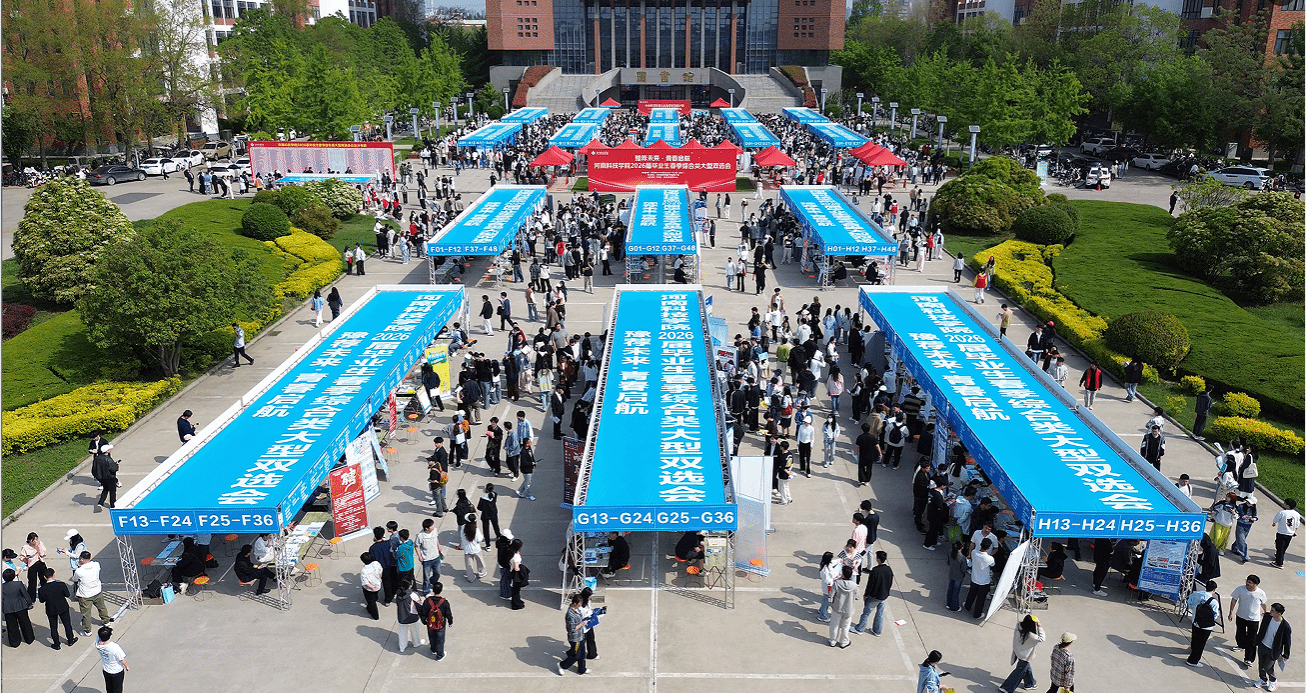 4月15日上午,河南科技学院“豫荐未来・青春启航”2026届毕业生春季综合类大型双选会在学校启智广场举行。校党委书记宋亚伟,党委副书记王庆兵,副校长丁轲,农业农村厅产业发展处副处长尹鹏以及各学院负责人到现场检查指导双选会组织开展情况。