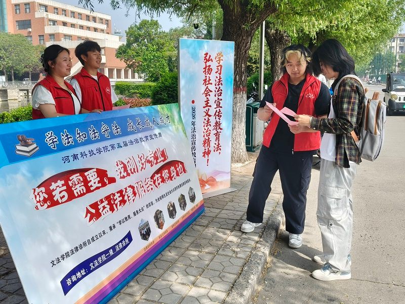 文法学院在校园内开展了法律咨询服务,针对劳动权益、校园侵权等法律问题向师生耐心细致地答疑解惑,进一步提升师生的法治意识和依法维权能力。
